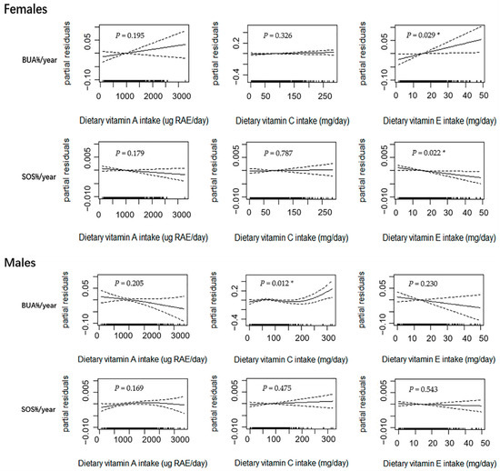 Relationships between dietary vitamin A, C, and E intakes and annual relative rates of change in BUA and SOS estimated using the generalized additive model (GAM) in female (n = 721) and male (n = 697) adolescents. Notes: Age, weight, height, dietary energy intake, dietary vitamin D intake, dietary calcium intake, physical activity, pubertal stage, and baseline bone phenotype were adjusted in the model. The y-axis is the partial residuals of changes in bone parameters after removing the effects of covariates. The x-axis is the estimated dietary vitamin A, C and E intakes, and the rug plot along the bottom represents each observation. The solid line indicates the fitted curve between variables. The dashed lines represent the 95% confidence intervals. RAE, retinol activity equivalents; BUA%/year, annual relative rate of change in broadband ultrasound attenuation; SOS%/year, annual relative rate of change in speed of sound; * p < 0.050.