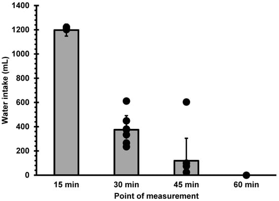 Voluntary water intake for each 15 min period. Bars represent average consumption and dots represent individual values of consumption. Only one participant did not interrupt rehydration at the 45 min point, but his intake from 45 to 60 min was negligible.
