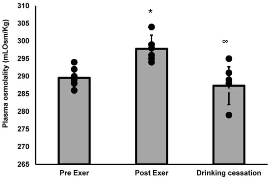 ANOVA analysis for plasma osmolality, * pre-exer vs. post-exer (dehydration) (p = 0.0006), pre-exer vs. drinking cessation (p = 0.524), ∞ post-exer (dehydration) vs. drinking cessation (p < 0.0001). Bar height represents average values; dots represent individual plasma osmolality.