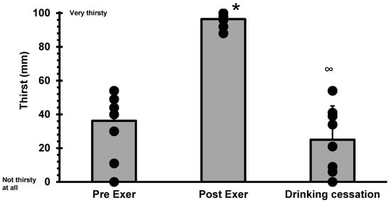 ANOVA analysis of thirst perception, no difference pre- vs. drinking cessation (p = 0.289), * pre-exer vs. post-exer (dehydration) (p < 0.0001), ∞ post-exer (dehydration) vs. drinking cessation (p < 0.0001). Bar height represents average values; dots represent individual thirst perception.