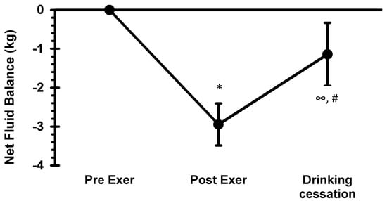 ANOVA analysis for net fluid balance * pre vs. post-exer (p < 0.0001) ∞ post-exercise (dehydration) vs. drinking cessation (p < 0.0001) # pre-exer vs. drinking cessation (p = 0.0012). Mean ± SD.