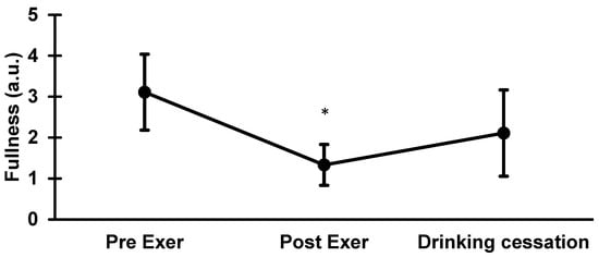 ANOVA analysis for fullness. Pre-exer and drinking cessation point (p = 0.055), pre-exer vs. post-exer (dehydration) (p = 0.0012), post-exer (dehydration) vs. drinking cessation (p = 0.251). * p > 0.05.
