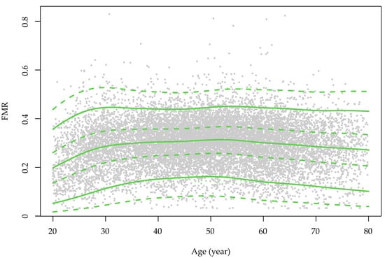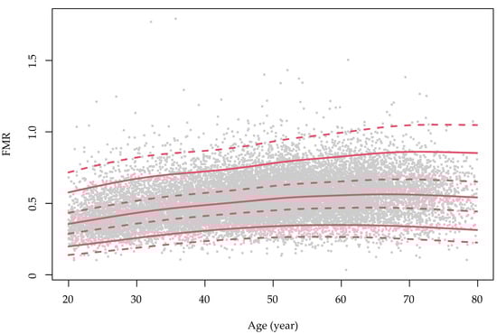 After excluding individuals with missing values for the FMR, SUA and eGFR, the final analytic sample included 31171 participants. Continuous data were presented as means with standard deviations (SDs), except for the eGFR, which was presented as the median (interquartile range, IQR) because of its high skew. Categorical variables were shown as frequencies and proportions. For descriptive purposes, the basic characteristics of the study population were presented according to presence or absence of HUA and reduced eGFR. The LMS (lambda, mu, sigma) method was used to construct the sex-specific growth curves of the FMR with advanced age [].