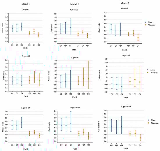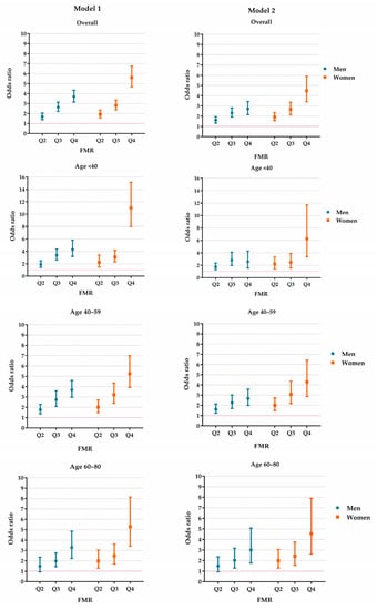 The age-stratified analyses revealed that, in men, the ORs of Q2–Q4 of FMR were similar between different age groups, but in women, the Q4 FMR group seemed to have a greater effect among younger females. Compared with the Q1 FMR group, Q4 group had an OR of 6.27 (3.35–11.73) among the group of participants aged <40, and we observed ORs of 4.29 (2.86–6.41) and 4.55 (2.62–7.89) in the groups aged 40–59 and 60 or above, respectively. In both the overall and the age-stratified analyses, the highest FMR group, Q4, had a greater effect among females than their male counterparts. Further details are available in Figure 2 and Supplementary Table S2.