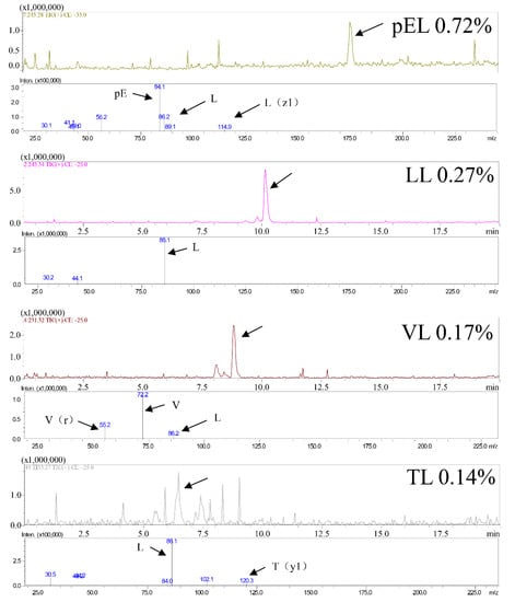 Figure 2 shows that the main peptide sequences in the CPs are pEL, LL, VL, and TL, and their proportions in the CPs are 0.72%, 0.27%, 0.17%, and 0.14%, respectively. Previous studies have shown that VL and LL exhibit protect liver effects [,] and TL exhibits inflammatory level inhibitory effects [,]. Therefore, CPS may have anti-inflammatory and protect liver functions due to the presence of these peptides.