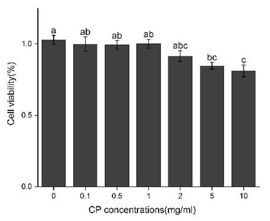 The cell viability of Kupffer cells was determined after treatment with different concentrations of CPs (0.1, 0.5, 1, 2, 5, 10 mg/mL). The results are shown in Figure 6. Compared with the control, the cell viability after treatment with 1 mg/mL did not show significant statistical difference for 12 h, while the treatment at the concentration of 2–10 mg/mL slightly decreased the cell viability; thus, the optimal concentration of CPS is below 2 mg/mL.