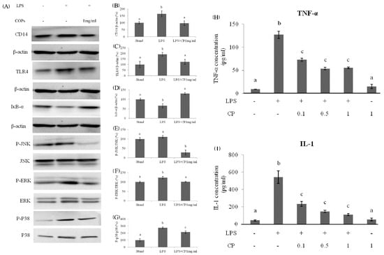 The effects of protein expression at 1 h after LPS administration in Kupffer cells: (A) Bands of proteins. The values of CD14 (B) and TLR4 (C) were normalized by the value of the total protein. (D) The effects of CPs on IkB-α degradation at 1 h after LPS administration in Kupffer cells. The expression levels of phosphorylated and total JNK, ERK, and p-38 protein were detected by western blotting. The value of JNK (E), ERK (F), and p-38 (G) were normalized by the value of the total protein. The effects of CPs on the TNF-α (H) and IL-1 (I) expression level in supernatants of KCs at 12 h after LPS treatment. Different letters represented the significant difference at p < 0.05.