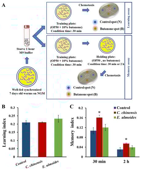 The ability of C. chinensis and E. ulmoides to improve the associative learning and memory of C. elegans was tested according to Kauffman et al. []. The diagram presented in Figure 2A briefly shows the procedures of the positive associative olfactory learning and memory assays. Seven-day old adult worms were collected, starved in M9 buffer for one hour, and then exposed to conditioning massed training. Illustratively, they were transferred to NGM plates containing OP50 mixed with 10% butanone. The plates were incubated at 22 °C for 30 min and the worms were tested before (I) and after (trained) butanone conditioning for chemotactic abilities as described above, but instead of NaCl, butanone was used as attractant and added directly to the B-spot (1µL of 10% butanone). The learning index (LI) was calculated according to LI = CITrained − CINaive.