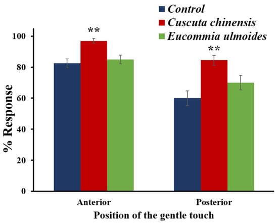 Impact of C. chinensis and E. ulmoides extract on the mechanosensory response of C. elegans to gentle touches on the 12th day of adulthood. The rate of behavioral responses of C. chinensis and E. ulmoides-treated worms to anterior and posterior touches were recorded for n ≥ 40 nematodes per treatment. The scores were represented as mean % ± SEM and significant differences to the control are considered with ** (p < 0.01) according to a one-way ANOVA and post-hoc Bonferroni test.