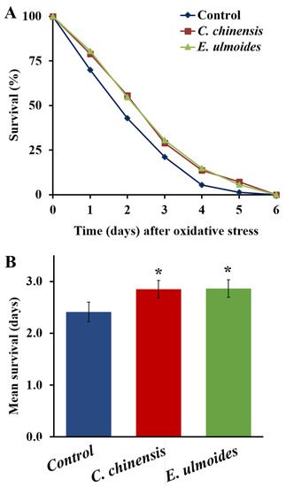 Augmenting the oxidative stress resistance of C. elegans treated with C. chinensis and E. ulmoides. (A) The survival curves of C. elegans treated with C. chinensis and E. ulmoides since L4 stage, during the exposure to oxidative stress (60 mM paraquat) starting on the 12th day of adulthood are shown. (B) The mean survival ± SEM from three biological replicates is shown in addition. Significant differences were determined by a log-rank test and subsequent Bonferroni correction with * p < 0.05.