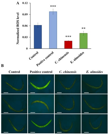 ROS level in C. elegans on the 12th day of adulthood treated with C. chinensis and E. ulmoides. (A) The mean normalized fluorescence intensity is shown for the HyPer transgenic strain on the 12th day of adulthood. Error bars represent the standard error of the mean (SEM) and significant differences to the control are considered with ** (p < 0.01) or *** (p < 0.001), according to a one-way ANOVA and post-hoc Bonferroni test. (B) Representative images for the fluorescence intensity of the HyPer transgenic strain treated with DMSO (control), 10 mM H2O2 (positive control), C. chinensis and E. ulmoides extract are shown. The white scale bars represent 200 µm.