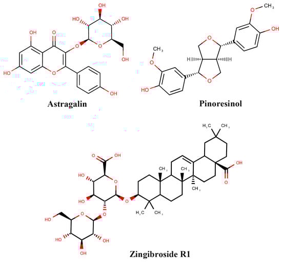 The chemical structure of the compounds (astragalin, pinoresinol, and zingibroside R1) from the seeds of C. chinensis.