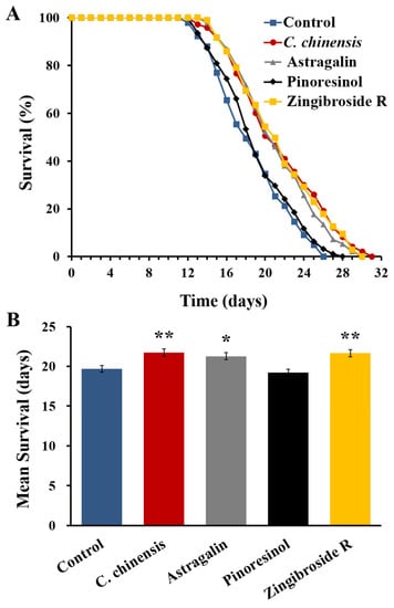 Effect of the C. chinensis extract and its fractions enriched in astragalin, pinoresinol, and zingibroside R1 on the lifespan of C. elegans. (A) Representative survival curves and (B) mean lifespan ± SEM from three biological replicates. Significant differences were determined by a log-rank test and subsequent Bonferroni correction with * p < 0.05 or ** p < 0.01.