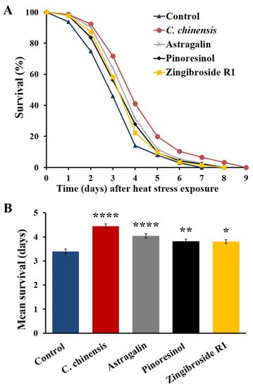 We next tested the potential of the C. chinensis extract and the fractions enriched in astragalin, pinoresinol and zingibroside R1 for their ability to improve the survival of C. elegans after heat stress exposures on the 12th day of adulthood. Treatment of the nematodes with astragalin, pinoresinol and zingibroside R1 significantly increased the mean survival by 19.2, 12.7, and 12.1%, respectively, compared to control (Table 5, Figure 8). Interestingly, C. chinensis, which was already known to boost the survival after heat stress [], showed the most effective survival improvement by boosting the mean, minimum, medium, and maximum C. elegans survival after heat stress (Table 5).