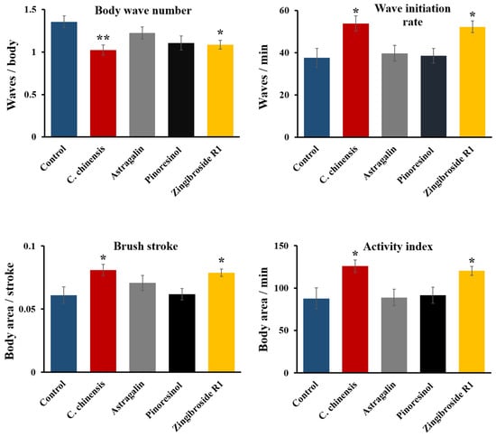 Swim performance of C. elegans after treatment with C. chinensis and its fractions enriched in astragalin, pinoresinol, and zingibroside R1. Body wave number, wave initiation rate, brush stroke, and activity index were determined on the 12th day of adulthood. Error bars are the standard error of the mean (SEM) and one bar represents n ≥ 50 from two independent trials. Statistical significance was determined according to a one-way ANOVA and post-hoc Bonferroni test with * (p < 0.05) and ** (p < 0.01).