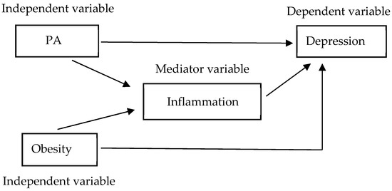 Inflammation may be as a mediating pathway in the development of depression. Obesity and PA may affect levels of inflammation and are also related to the development of depression [9,13,14,16]. Very few studies have examined the relationship between obesity, PA, depression, and the potential mediating role of inflammation in older diabetes patients. Further clarification of these associations is required. According to Baron and Kenny’s four-step approach [18,19], we proposed the following a priori hypotheses: (1) PA or obesity will significantly predict depression; (2) PA or obesity will significantly predict inflammation; (3) inflammation will significantly predict depression; and (4) after adjusting for inflammation, the association between PA or obesity and depression will be reduced (partial mediation by inflammation) or will no longer be significant (complete mediation by inflammation). In addition, the Sobel test was used as a supplementary technique [20].