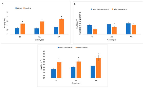 BMI levels were significantly different between active and inactive participants and between SSB consumers and non-consumers across all FTO rs9939609 genotype groups. Significant differences in BMI levels were found between wine consumers and non-consumers within the wild-type (TT) and heterozygote (TA) genotypes (Figure 1).