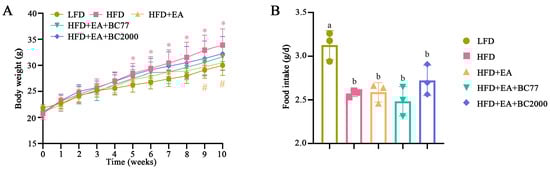 Impact of BC2000 on body weight (A) and food intake (B) of HFD mice. * indicates a significant difference compared with the LFD group (p < 0.05); # indicates a significant difference compared with the HFD group (p < 0.05); Different lowercase letters above bars indicate significant differences among groups (p < 0.05). n = 10/group. Values show mean ± SD. Tukey’s test based on a one-way analysis of variance was used for multiple comparisons. LFD: low-fat-diet group; HFD: high-fat-diet group; HFD+EA: high-fat-diet supplemented with ellagic acid; HFD+EA+BC77: high-fat-diet supplemented with ellagic acid and W. coagulans BC77; HFD+EA+BC2000: high-fat-diet supplemented with ellagic acid and W. coagulans BC2000.