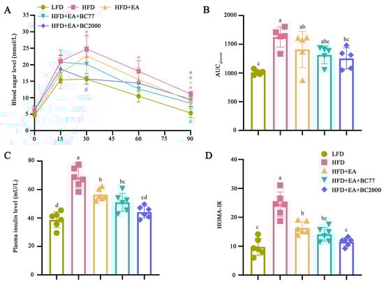 Impact of BC2000 on glucose homeostasis and insulin resistance in obese mice: (A) blood sugar level; (B) AUC; (C) plasma insulin level; (D) HOMA-IR. * indicates a significant difference compared with the LFD group (p < 0.05). # indicates a significant difference compared with the HFD group (p < 0.05). Different lowercase letters above bars indicate significant differences among groups (p < 0.05). Blood sugar level and AUC (n = 5/group). Plasma insulin level and HOMA-IR (n = 6/group). Values show mean ± SD. Tukey’s test based on a one-way analysis of variance was used for multiple comparisons. LFD: low-fat-diet group; HFD: high-fat-diet group; HFD + EA: high-fat-diet supplemented with ellagic acid; HFD + EA + BC77: high-fat-diet supplemented with ellagic acid and W. coagulans BC77; HFD + EA + BC2000: high-fat-diet supplemented with ellagic acid and W. coagulans BC2000.