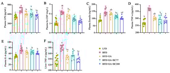 Impact of BC2000 on inflammatory cytokines in obese mice: (A) plasma LPS; (B) plasma hs-CRP; (C) plasma Zonulin; (D) plasma TNF-α; (E) plasma IL-6; (F) liver TNF-α. Different letters indicate significant differences (p < 0.05). n = 9/group. Values show mean ± SD. When variances of the study results were homogeneous, Tukey’s test based on one-way analysis of variance (ANOVA) was used for multiple comparisons. When the variances were not homogeneous, the Kruskal–Wallis test was used. LFD: low-fat-diet group; HFD: high-fat-diet group; HFD+EA: high-fat-diet supplemented with ellagic acid; HFD + EA + BC77: high-fat-diet supplemented with ellagic acid and W. coagulans BC77; HFD + EA + BC2000: high-fat-diet supplemented with ellagic acid and W. coagulans BC2000.