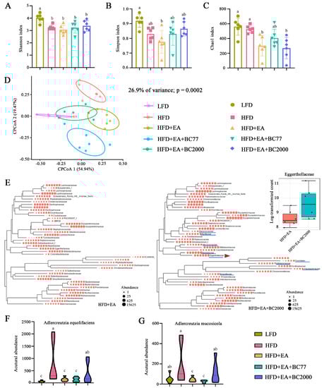 Impact of BC2000 on cecum microbiota in obese mice: (A) Shannon index; (B) Simpson index; (C) Chao1 index; (D) CPCoA; (E) phylogenetic trees of gut microbiota families of HFD+EA and HFD+EA+BC2000 groups and relative content of Eggerthellaceae (inset). (F) The abundance of Adlercreutzia equolifaciens of Eggerthellaceae. (G) The abundance of Adlercreutzia mucosicola of Eggerthellaceae. Different letters indicate significant differences (p < 0.05). n = 6/group. Values show mean ± SD. When variances in the study results were homogeneous, Tukey’s test based on one-way analysis of variance (ANOVA) was used for multiple comparisons. When the variances were not homogeneous, the Kruskal–Wallis test was used. LFD: low-fat-diet group; HFD: high-fat-diet group; HFD + EA: high-fat-diet supplemented with ellagic acid; HFD + EA + BC77: high-fat-diet supplemented with ellagic acid and W. coagulans BC77; HFD + EA + BC2000: high-fat-diet supplemented with ellagic acid and W. coagulans BC2000.
