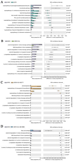 Significant differences (FDR-adjusted p-value < 0.05) between groups in MetaCyc Gene Pathways predicted by PICRUSt2. (A) HFD VS LFD; (B) HFD VS HFD + EA; (C) HFD VS HFD + EA + BC77; (D) HFD VS HFD + EA + BC2000. n = 6/group. Data are expressed with log2FC. Differential expression is analyzed using the edgeR software. LFD: low-fat-diet group; HFD: high-fat-diet group; HFD + EA: high-fat-diet supplemented with ellagic acid; HFD + EA + BC77: high-fat-diet supplemented with ellagic acid and W. coagulans BC77; HFD + EA + BC2000: high-fat-diet supplemented with ellagic acid and W. coagulans BC2000.