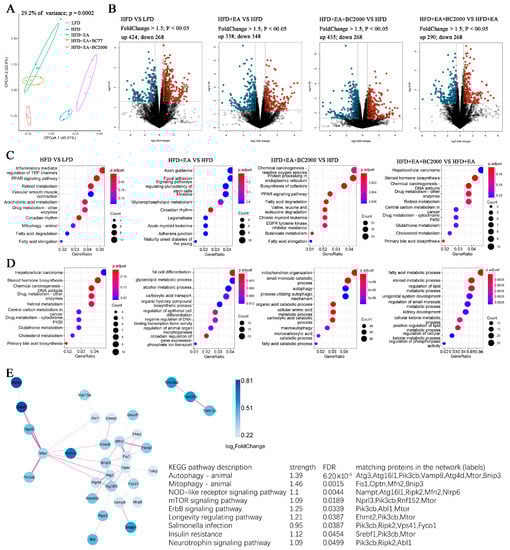 Impact of BC2000 on gene expression in mouse liver; (A) CPCoA; (B) volcano plot; (C) GO enrichment analysis of biological processes; (D) GO enrichment analysis of molecular functions; (E) interaction network map of the KEGG pathway based on differentially expressed genes. n = 4/group. LFD: low-fat-diet group; HFD: high-fat-diet group; HFD + EA: high-fat-diet supplemented with ellagic acid; HFD + EA + BC77: high-fat-diet supplemented with ellagic acid and W. coagulans BC77; HFD + EA + BC2000: high-fat-diet supplemented with ellagic acid and W. coagulans BC2000.