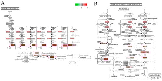 KEGG pathway analysis. (A) KEGG pathway map of fatty acid degradation signaling pathway; (B) KEGG pathway map of valine, leucine and isoleucine degradation signaling pathway. n = 4/group. LFD: low-fat-diet group; HFD: high-fat-diet group; HFD + EA: high-fat-diet supplemented with ellagic acid; HFD + EA + BC77: high-fat-diet supplemented with ellagic acid and W. coagulans BC77; HFD + EA + BC2000: high-fat-diet supplemented with ellagic acid and W. coagulans BC2000.