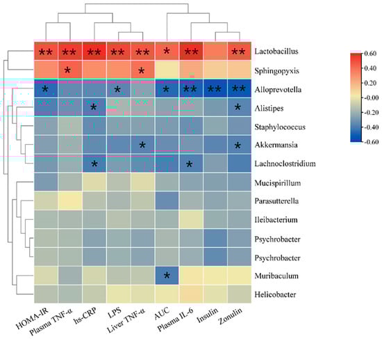 Heat map for correlations between biochemical indicators and gut microbiota. The X-axis and Y-axis of the heat map represent biochemical indicators and gut microbiota, respectively. The R and p values are calculated. The R values are expressed with different colors. The color card on the right side shows the color ranges of different R values. The “*” symbol indicates a significant correlation at the 0.05 level; ** indicates s significant correlation at the 0.01 level. The top clusters represent the clustering of biochemical indicators, and the left-side clusters represent the clustering of gut microbiota.