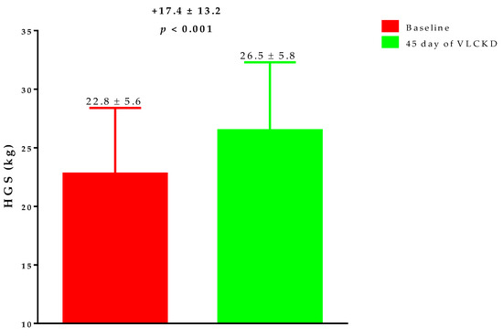 The change in HGS during the 45 days of active phase VLCKD. After 45 days of VLCKD, HGS measures were significantly increased (p < 0.001). VLCKD, very low-calorie ketogenic diet; HGS, handgrip strength.