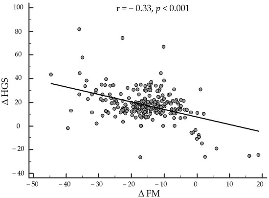 Correlation between changes in ∆HGS and ∆FM after adjusting for ∆BMI, ∆WC, ∆hs-CRP levels, and physical activity.