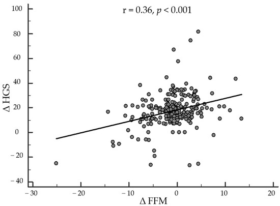 Correlation between changes in ∆HGS and ∆FFM after adjusting for ∆BMI, ∆WC, ∆hs-CRP levels, and physical activity.