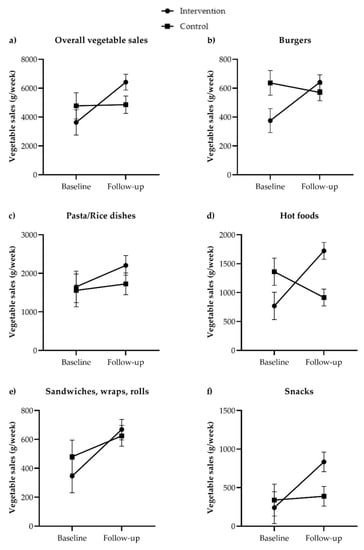 ) for overall vegetable sales (a), and vegetable sales per menu subcategory (b–f) in grams of vegetables/week based on the linear mixed models.