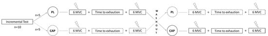 Experimental design of the study. After familiarization, participants reported to the lab on the first day for an incremental test. One week later, they were allocated in one of the two conditions, placebo (PL) or capsaicin (CAP). The neuromuscular assessment then started with 6 maximal voluntary contractions (MVC) using the interpolated twitch technique, which was repeated immediately following the time to exhaustion trial (85% Wpeak of the incremental test). After one week of washout, the participants proceeded with the same assessments with the other condition.