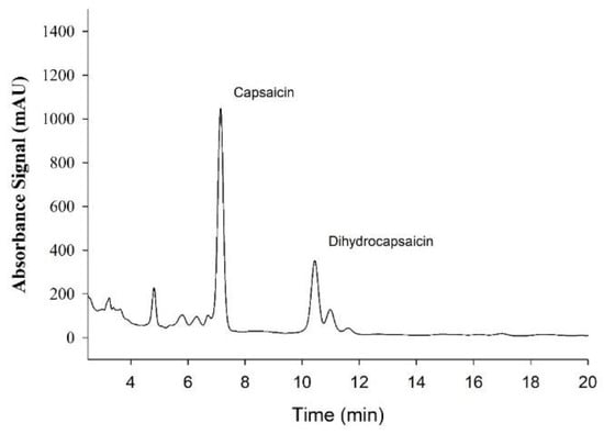 Sample Absorbance signal from High-Performance Liquid Chromatography (HPLC) analysis of Capsaicin supplement used for the quantification of the Capsaicinoids, Capsaicin, and Dihydrocapsaicin.