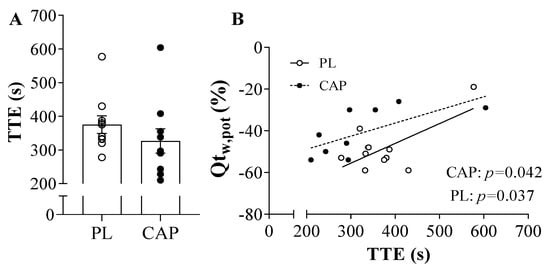 Time to exhaustion (TTE) and its correlation with the resting potentiated twitch (QTw,pot) after exercise (n = 10). (A) Time to exhaustion in individual valued after CAP or PL ingestion; (B) Time to exhaustion correlated with the QTw,pot showed a significant positive correlation in both PL (r = 0.7, p = 0.04) and CAP (r = 0.7, p = 0.04). Values are presented as individual data and Mean ± SEM.