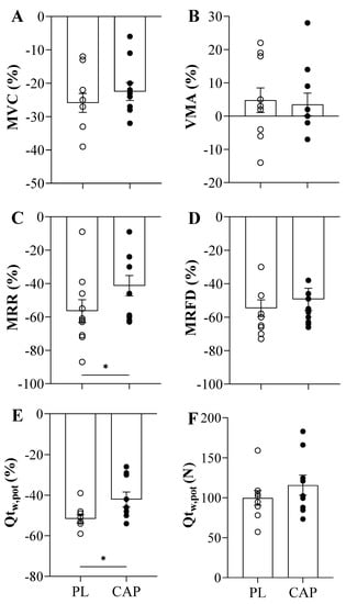 Both placebo and capsaicin conditions showed similar exhaustion (TTE) time of 375 ± 26 and 327 ± 36 s, respectively (p > 0.05, Figure 3A). Regarding the force before exercise, the MVCs were not different between the two conditions (640 ± 127 vs. 643 ± 161 N, p > 0.05), as well as after the TTE (479 ± 125 vs. 499 ± 133 N, p > 0.05). Accordingly, the baseline resting twitches (Qtw,pot) showed similar values (201± 64 vs. 205 ± 59 N, p > 0.05), but trended towards a greater Qtw,pot immediately following exercise in the CAP condition as compared to the PL condition (100 ± 28 vs. 116 ± 37 N, p = 0.07, Figure 4F). This is also seen in the percentage change in post-exercise decline in Qtw,pot in the two conditions, which reached statistical significance (−52 ± 6 vs. −42 ± 11 %, p = 0.037, Figure 4E). When the potentiated twitch (Qtw,pot %) was plotted as a function of TTE, significant positive correlation with both PL (r = 0.7, p = 0.04) and CAP (r = 0.7, p = 0.04) was observed (Figure 3B). VMA% was not affected by either exercise or the supplement (p > 0.05). Looking at the intrinsic muscle contractile functions, MRR and MRFD showed significant reductions in pre-to-post TTE (p < 0.000). In addition, CAP mitigated the exercise-induced decline in MRR (p = 0.01; Figure 4C). Specifically, in the PL condition, MRR was reduced by 57 ± 22%, while only attenuated by 41 ± 19% in CAP. In contrast, MRFD decreased similarly in both conditions, namely, by 55 ± 16% and 49 ± 21% in PL and CAP, respectively (Figure 4D).