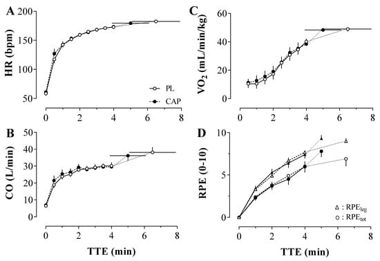 Central hemodynamic (Heart rate (HR); Cardiac output (CO); Panel (A,B)). Oxygen consumption (VO2; Panel (C)) and perceived exertion (RPE; Panel (D)) throughout the time to exhaustion (TTE) under Placebo (PL) and Capsaicin (CAP) Conditions (n = 10). In panel (D), RPE is represented as the rating of perceived exertion of the lower limbs (RPEleg; triangle) and whole-body (RPEtot; dot). Values are presented as Mean ± SEM.