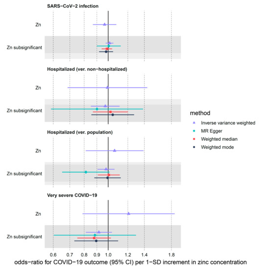 We found little evidence in favor of the genetically predicted circulating zinc concentration having a large effect on COVID-19 outcomes (Table 1, Figure 1). IVW odds ratios of SARS-CoV-2 infection were 0.97 (95% CI: 0.87–1.08, nominal p-value = 0.55) in the main analysis and 1.01 (95% CI: 0.98–1.05, nominal p-value = 0.49) in the sensitivity sub-significant (max p-value of 5 × 10−5) analysis, per 1 SD increase of circulating zinc. Hospitalization (ver. Population) showed weak evidence of association with zinc levels (OR = 1.06, 95% CI: 0.81–1.39, p-value = 0.66) in the main analysis and sub-significant analysis (OR = 0.98, 95% CI: 0.91–1.06, p-value = 0.62). Similar results were obtained for the hospitalized (ver. Non-hospitalized) outcome (Table 1, Figure 1). Lastly, we did not find a strong effect for zinc on all severe diseases included in the main analysis (OR = 1.21, 95% CI: 0.79–1.86, p-value = 0.39). A narrower but overlapping estimate was derived from the more liberal set of SNPs (OR = 0.92, 95% CI: 0.81–1.04, p-value = 0.16). Estimates in the sensitivity analyses using MR-Egger, median-weighted and mode-weighted estimator directionally matched the results from IVW (Figure 1, Supplementary Table S8).