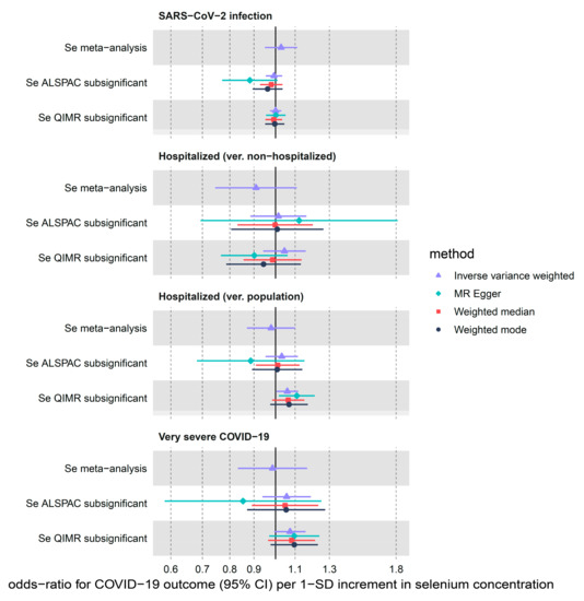 We detected a weak causal effect of meta-analysed selenium levels (per 1 SD increment) on SARS-CoV-2 infection, COVID-19 hospitalization and critical illness (Table 1 and Figure 2). IVW odds ratio of SARS-CoV-2 infection using the instruments in the GWAS meta-analysis of Se blood and toe-nail levels was 1.03 (95% CI: 0.95–1.11, nominal p-value = 0.5), while in the ALSPAC and QIMR sub-significant (max p-value of 5 × 10−5) sensitivity analyses, we found narrower CI intervals also overlapping 1: OR = 0.99 (95% CI: 0.95–1.03, p-value = 0.70) and 1.00 (0.97–1.03, p-value = 0.97), accordingly. Similar results were found for protection against hospitalization (ver. population) using the main (OR = 0.98; 95% CI: 0.87–1.10, p-value = 0.71), ALSPAC (OR = 1.03, 95% CI: 0.95–1.12, p-value = 0.45) and QIMR (OR = 1.06, 95% CI: 1.00–1.12, p-value = 0.03) sub-significant sets of instruments. The nominally significant increased risk of hospitalization with COVID-19 in the QIMR cohort did not survive multiple-correction testing. Similar estimates were found in the hospitalized COVID-19 (vs. non-hospitalized) comparison; however, for this outcome the point-estimate ORs were <1 in the QIMR cohort using the following sensitivity methods: MR-Egger, weighted median and mode (Figure 2, Supplementary Table S8). Finally, increased genetically predicted selenium levels did not causally associate with COVID-19 severity using the meta-analysis (OR = 0.99, 95% CI: 0.83–1.17, p-value = 0.86), ALSPAC (OR = 1.06; 95% CI: 0.94–1.19, p-value = 0.37) or QIMR (OR = 1.07; 95% CI: 0.99–1.16, p-value = 0.07) sub-significant instruments.