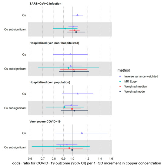 MR estimates for the effect of circulating copper (Cu) on three COVID-19 outcomes obtained using 4 different statistical methods. We used the following two sets of copper instruments: Cu refers to instruments with p-values < 5 × 10−8 and sub-significant Cu refers to instruments with p-values < 5 × 10−5.