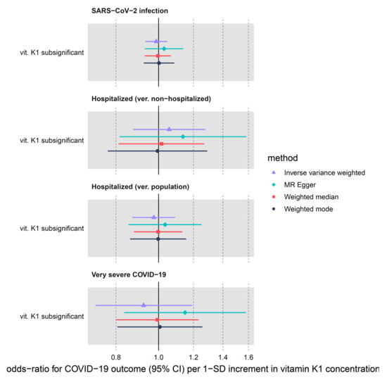 Using a limited set of three vitamin K1 genome-wide sub-significant (max p-value of 5 × 10−5) instruments, we were not able to detect any strong effect of genetically predicted circulating vitamin K1 on COVID-19 outcomes (Table 1, Figure 4). In the IVW analysis, vitamin K1 increment (per natural log transformed nmol/L) associated with OR of 0.99 (95% CI: 0.93–1.05, p-value = 0.68) for SARS-CoV-2 infection. Next, both hospitalization (ver. population) and very severe COVID-19 showed a lower OR for increased vitamin K1 exposure (OR = 0.98, 95% CI: 0.87–1.09, p-value = 0.66 and OR = 0.93, 95% CI: 0.72–1.19, p-value = 0.55, respectively) but the CI comfortably overlapped with OR on either side of 1. The confidence intervals for our sensitivity methods (MR-Egger, weighted median and mode) overlapped the IVW CI, although the OR point estimates sometimes differed in terms of direction of effect.