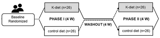 Participants voluntarily enrolled in the study from 3 January 2019, to 1 April 2020. A randomized, two-period crossover clinical trial was conducted with one washout period (Figure 1). The participants reported general information via interviews and diet intake via a 24-h dietary recall before the study began. The participants were randomly assigned to two groups using computer-generated random numbers, and the K-diet or control diet was randomly allocated for the first trial. After the first trial, a four-week washout period was performed, and participants were interviewed for diet intake via a 24-h dietary recall during the washout period. The diet was switched for the four-week second trial. The participants lived without restrictions, and meals, including beverages and snacks, were delivered to the house, as participants preferred each meal to be prepared by the food company. Compliance with meal consumption was assessed by submitting photographs before and after each meal to the researcher. The leftovers were estimated from the photographs and were reflected in the estimated food intake of the participants. The nutrient intake was calculated from the estimated food intake by subtracting the leftovers in the photos using a Computer-Aided Nutritional analysis program (CAN-pro 3.0; Korean Nutrition Society, Seoul, South Korea). Participants were encouraged to maintain their physical activity levels and restrict alcohol consumption. Energy and nutrient intake were estimated during the washout period via a 24-h dietary recall.