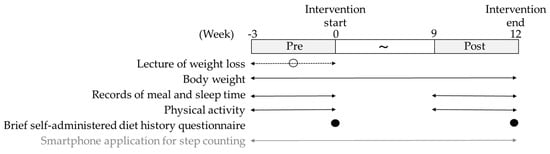 This study was a secondary analysis of “a study of the effect of using a smartphone application for step counting on weight loss”. The study was a randomized controlled trial of a 12-week weight loss support program in smartphone applications and non-smartphone applications (Figure 1). Weeks −3 to 0 (measurement before the intervention) were referred to as pre-intervention, and weeks 9–12 (measurement after the intervention) were referred to as post-intervention. After the research briefing, the participants attended a lecture on setting a body weight loss target of −5% from their current body weight, a dietary alternative based on −100 kcal/day and increasing physical activity (+1000 steps/day or more). Subsequently, the participants continued to measure their body weight and step counts in the application until the end of the intervention, and they provided updates on their weight loss and increased physical activity once a month by e-mail. In this intervention study, the weight loss rate was not significantly different between the application and non-application groups []. Additionally, no difference was observed in the weight change rate between the application and non-application groups for both men and women in this study. Therefore, there may be no difference in weight loss effects when using a smartphone application for step counting, and this study analyzed the two groups together as a single group.