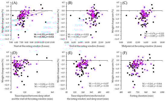 Correlation between meal timing and body weight loss. Scatter plots (black: men (n = 51); pink: women (n = 46)) show the correlations between weight change rate and the start of the eating window (A), the end of the eating window (B), the midpoint of the eating window (C), the time elapsed between sleep offset and the start of the eating window (D), the time elapsed between the end of the eating window and sleep onset (E), the fasting duration (F). M, men: W, women. The p-values were derived from the non-paired t-test, and “r” indicates the correlation coefficient by Pearson’s correlation analysis.