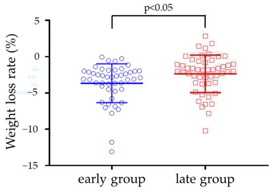 Based on these results, the median of the start of the eating window at pre-intervention was used to divide the men and women into the following two groups: the early group (25 men and 22 women) and the late group (26 men and 24 women). The start of the eating window was 6:48 ± 0:22 AM for the early group and 8:09 ± 1:05 AM for the late group in the pre-intervention (p < 0.001). The weight change rate was −3.8 ± 2.7% in the early group and −2.2 ± 2.5% in the late group (Figure 3). The weight loss rate in the early group was higher than that in the late group, even after adjusting for age, sex, pre-BMI, and use of a smartphone application for step counting (p < 0.05).