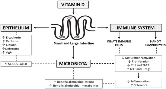 Vitamin D regulates calcium and phosphate metabolism, contributing to optimal bone homeostasis [1]. Besides effects on bone, vitamin D has also been linked to a wide range of biological activities, including modulation of gut mucosal immunity and the integrity of the intestinal barrier [2,3]. Consequently, vitamin D deficiency has been associated with the activity of immune-mediated diseases, including inflammatory bowel disease (IBD). A pathogenetic role in chronic inflammatory diseases, including IBD, has also been advocated.