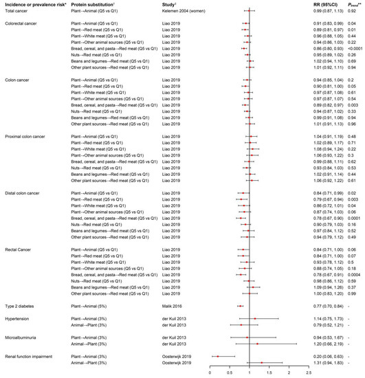 A total of six studies reported isocaloric substitutional effects of plant and animal protein intake on incidence or prevalence risk of different aging-related diseases: two studies focused on total cancer [31] or colorectal cancer (CRC) risk [32], one study analyzed data of three cohorts reported T2D risk [33], one on hypertension risk [37], and two studies investigated chronic kidney disease and microalbuminuria risk (Figure 2) [37,38]. No association for substitution of total plant for total animal protein on overall cancer risk was observed in the IWHS (RR = 0.99, 95% CI = 0.87–1.13) [31]. In contrast, the NIH–AARP study reported an inverse association with overall CRC risk (HRQ5 VS. Q1 = 0.91, 95% CI = 0.83–0.99; Ptrend = 0.04), rectal cancer risk (HRQ5 VS. Q1 = 0.84, 95% CI = 0.71–1.00), and distal colon cancer risk (HRQ5 VS. Q1 = 0.84, 95% CI = 0.71–0.99) but not with proximal colon cancer risk. The inverse associations appeared to be limited to substituting total plant protein for red meat protein [32]. When further evaluating different plant proteins, the significant reduction in CRC risk was only limited to the substitution of protein from bread, cereal, and pasta for red meat protein, and this protective effect was stronger for rectal cancer and distal colon cancer than proximal colon cancer [32].