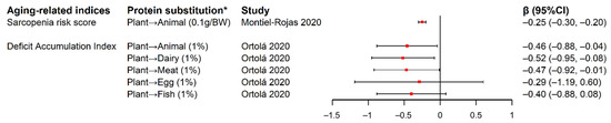 Forest plot of estimated changes and 95% CIs in aging-related indices in relation to isocaloric substitution of plant-based protein for animal-based protein. * Symbol “→” represents substitution of protein from the left-side food source for protein from the right-side food source. “Plant” and “Animal” stands for “all the plant-based food sources” and “all the animal-based food sources”, respectively. The content in the bracket after the substitution exposure describes the substituted exposure’s unit and data type: “0.1g/BW” in the study by Montiel-Rojas et al. was substitution of 0.1g total plant protein per body weight for the detriment of total animal protein. “1%” in the study by Ortolá et al. referred to substitution of 1% of total energy intake from total plant protein for various animal-based proteins. Abbreviation: BW, body weight; CI, confidence interval.