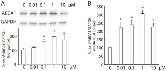 Effects of 2-ME2 on the expression of ABCA1 in HepG2 cells. (A) ABCA1 protein expression in HepG2 cells treated with 2-ME2 at varying doses for 24 h. (B) Effect of 2-ME2 on the mRNA level of ABCA1 expression. An abundance of GAPDH served as the control, and the relative expression of ABCA1 to GAPDH is shown as a percent of the control in the histogram. The histogram shows the mean ± SEM (n = 3) of separate experiments for each group. * p < 0.05 compared to 0.